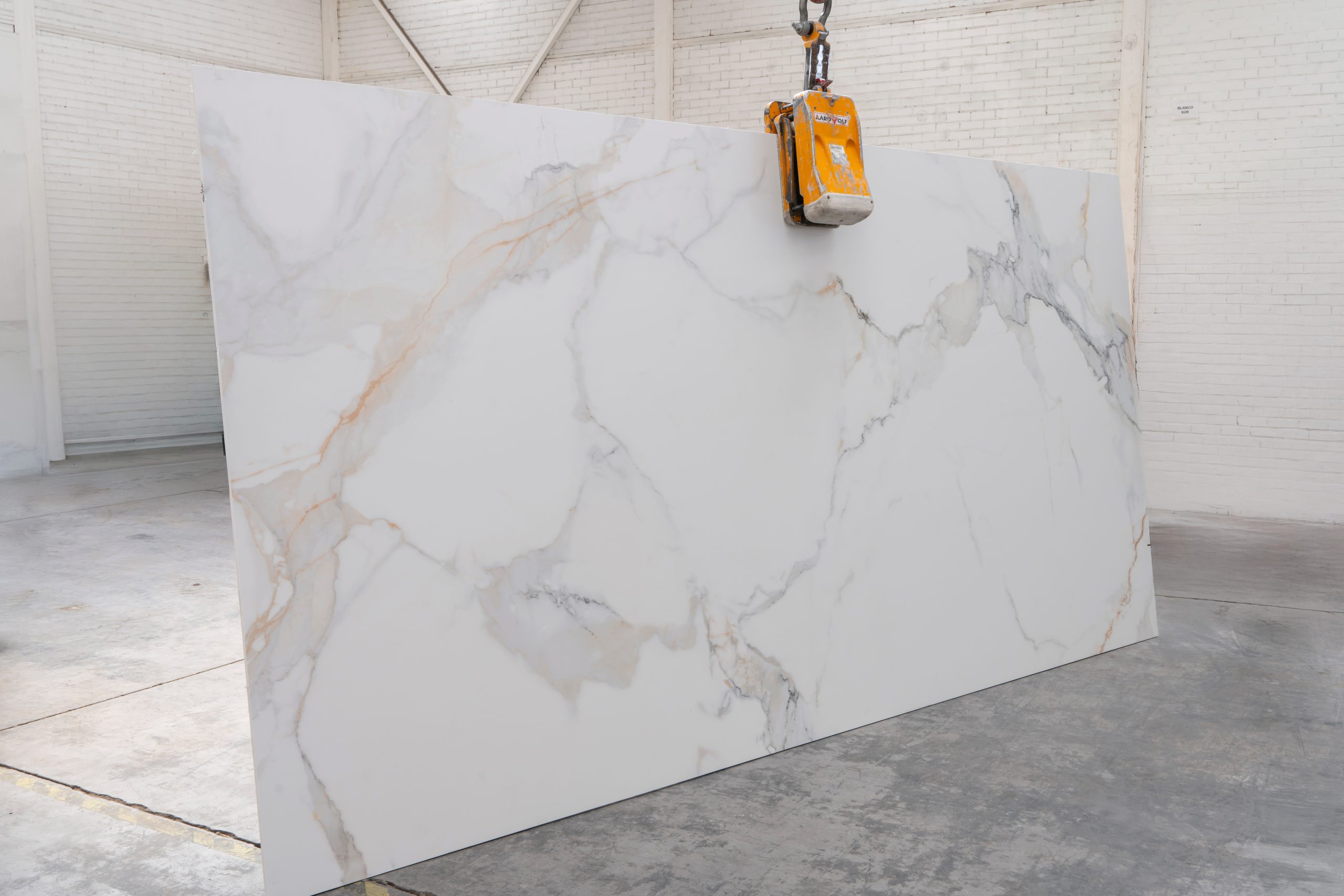 Calacatta Golden es una cubierta Ultracompacto de fondo blanco luminoso, con vetas grises y doradas inspiradas en el mármol Calacatta. Su superficie no porosa, de alta resistencia al calor, rayaduras y manchas, la hace ideal para cubiertas de cocina, islas y revestimientos interiores, combinando diseño sofisticado, durabilidad y fácil mantención en proyectos residenciales y comerciales.