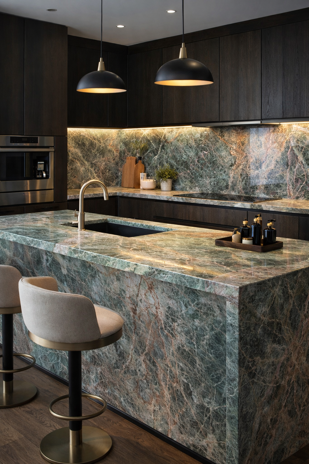 La cuarcita Maragogi es una piedra natural de carácter excepcional, reconocida por su poderosa identidad visual. Sus intensos tonos verdes, recorridos por vetas doradas de trazo orgánico, crean una composición sofisticada que equilibra fuerza, profundidad y elegancia natural.
