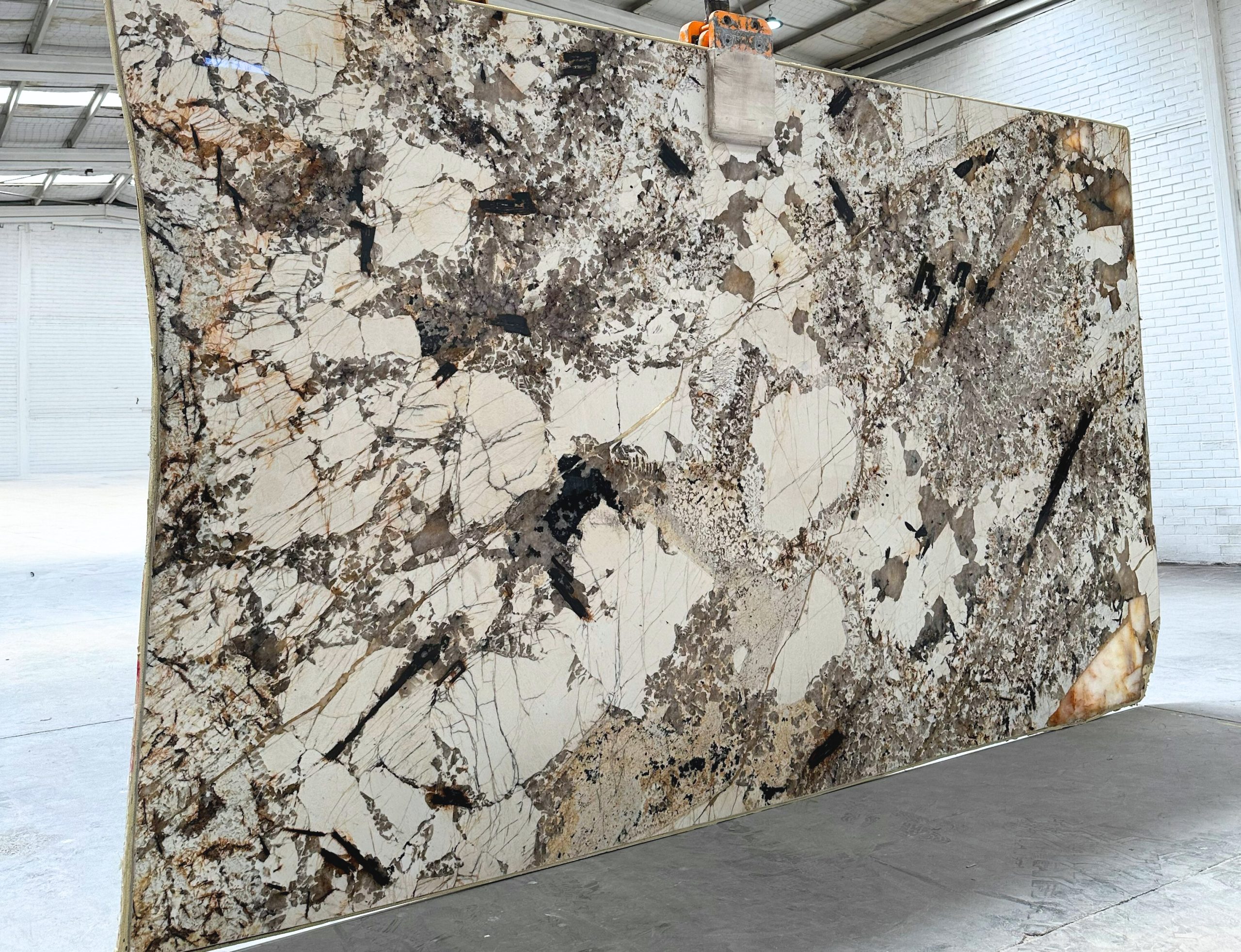 La cuarcita Patagonia es una piedra natural de carácter monumental y estética única. Su composición combina grandes fragmentos minerales en tonos blancos, grises y ocres, creando una textura orgánica y poderosa que convierte cada placa en una obra irrepetible.