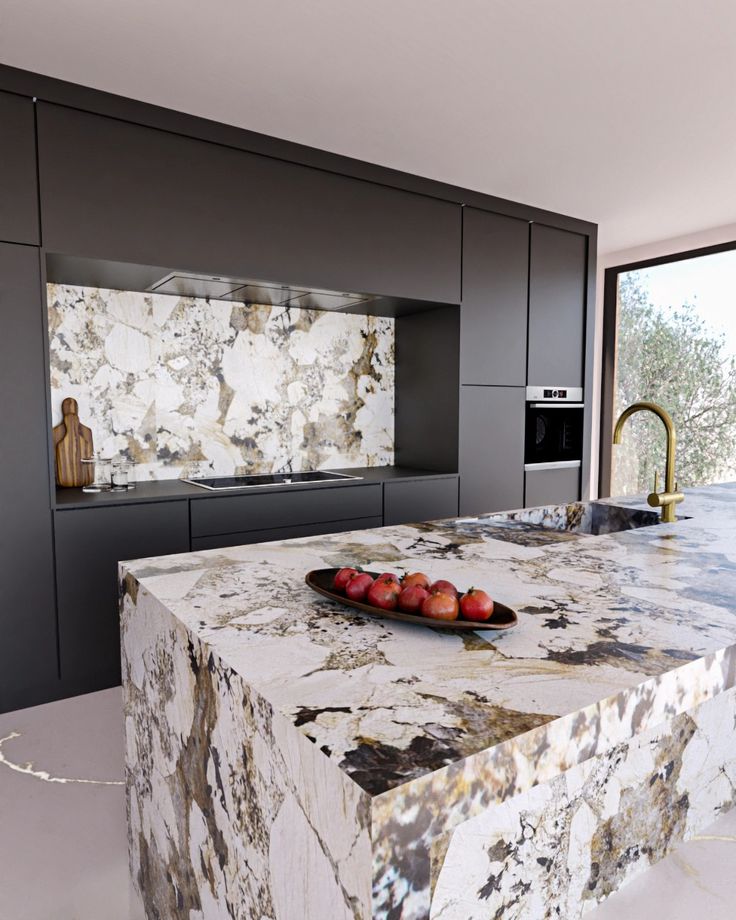 Perfecta para cubiertas, islas, barras y muros escénicos donde la piedra no solo reviste, sino que comunica identidad, sofisticación y visión de futuro.